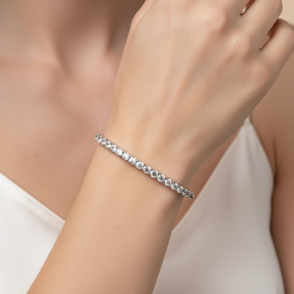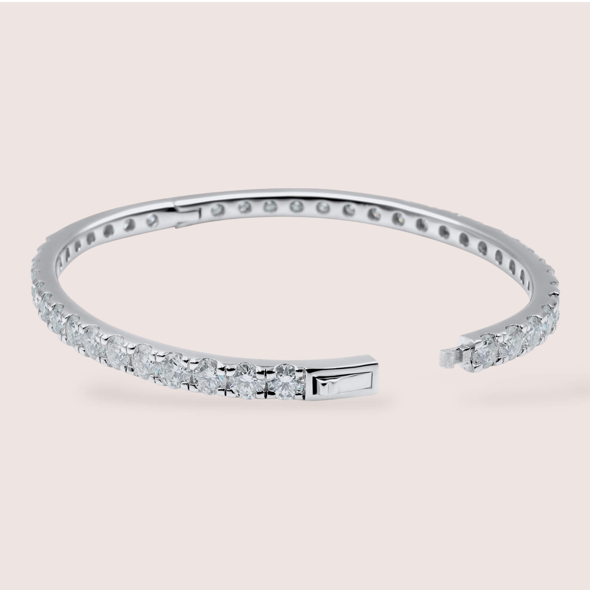 Ta elegancka bransoletka bangle wykonana ze srebra, ozdobiona moissanitami o średnicy 4 mm, emanuje luksusem i subtelnym blaskiem. Idealnie dopasowuje się do nadgarstka, tworząc stylowy akcent, który łączy nowoczesność z klasycznym pięknem.