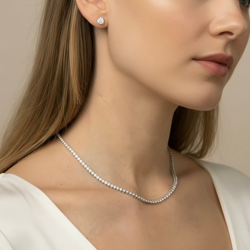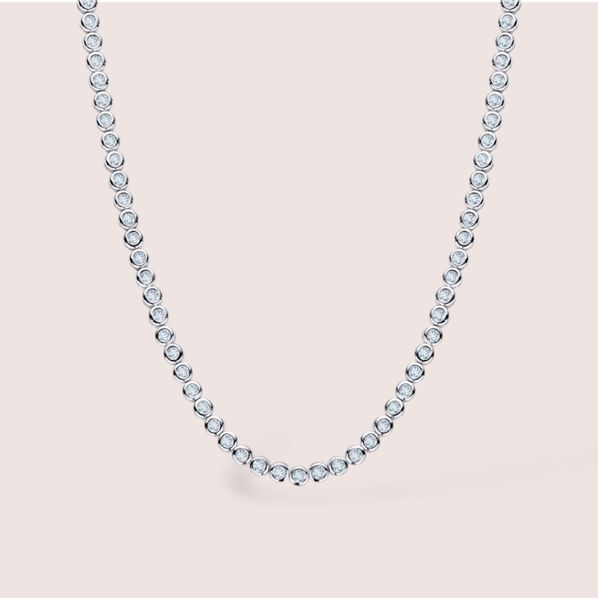 Naszyjnik tenisowy z moissanitami o średnicy 2mm, wykonany z wysokiej jakości srebra 925, cechuje się klasycznym designem z precyzyjnie osadzonymi kamieniami w pełnej oprawie, a wygodne zapięcie zapewnia bezpieczeństwo i komfort noszenia.
