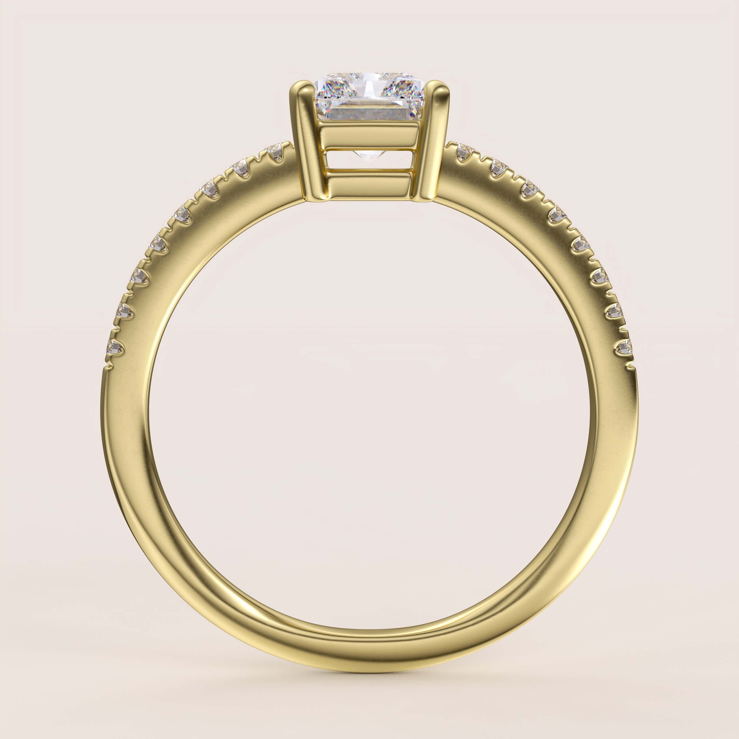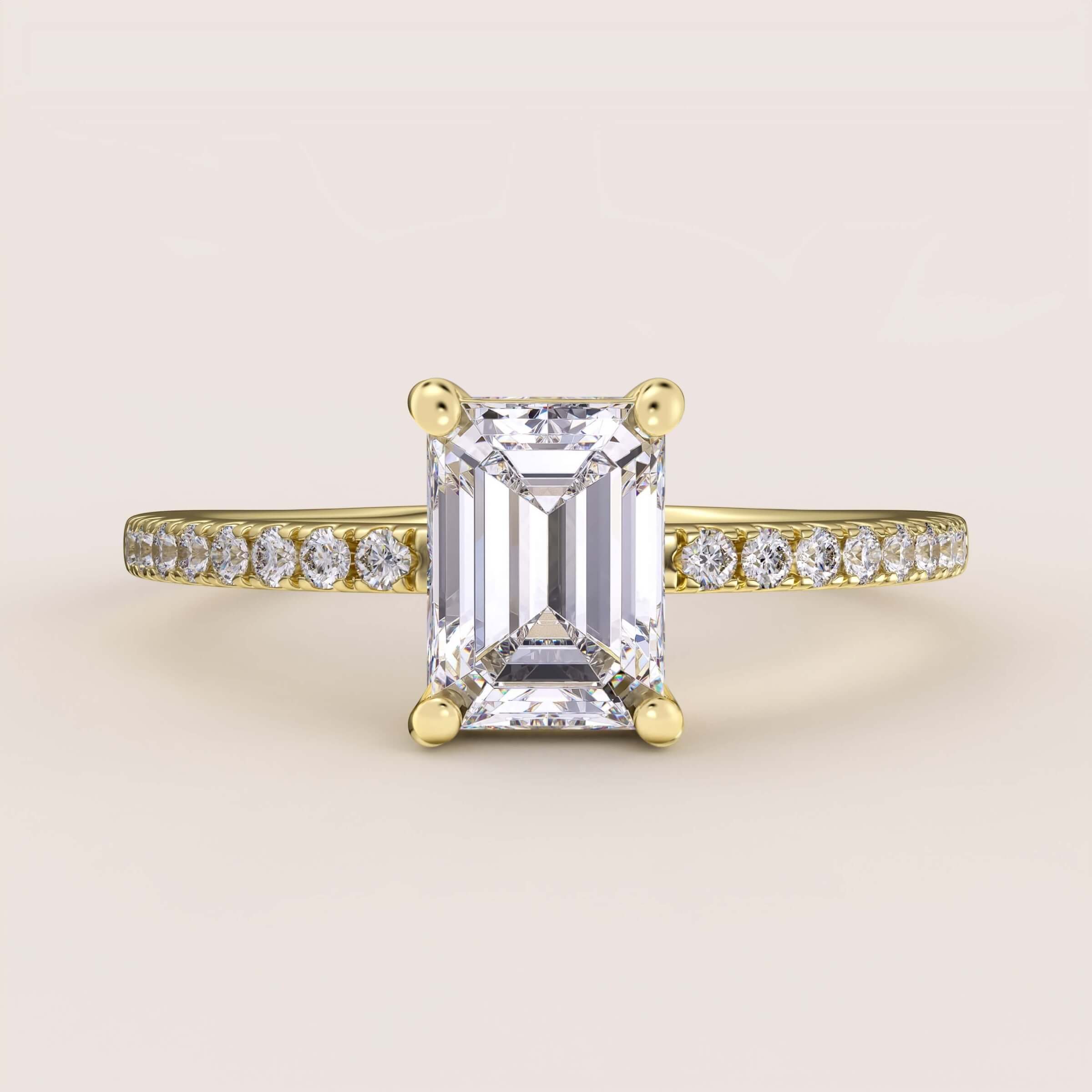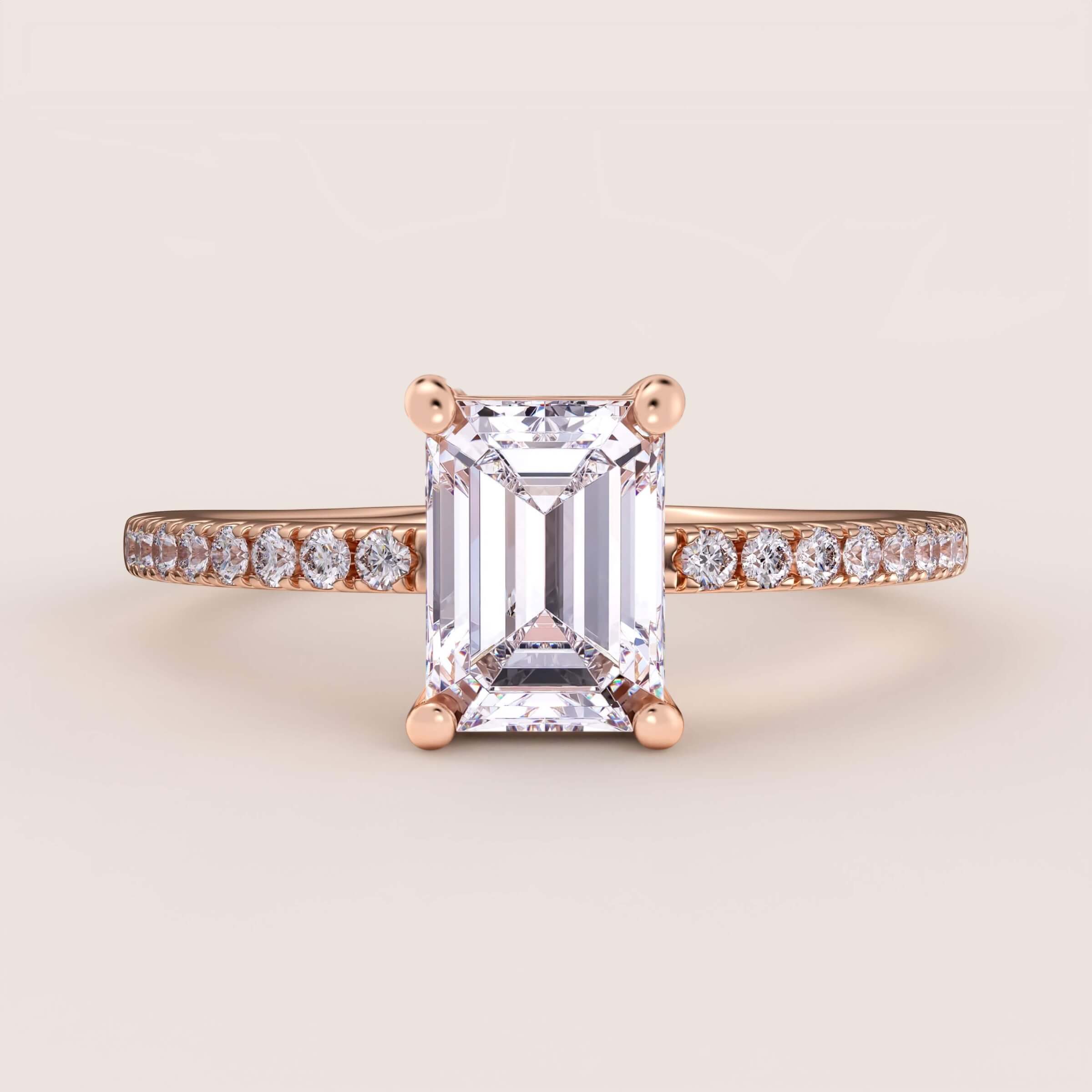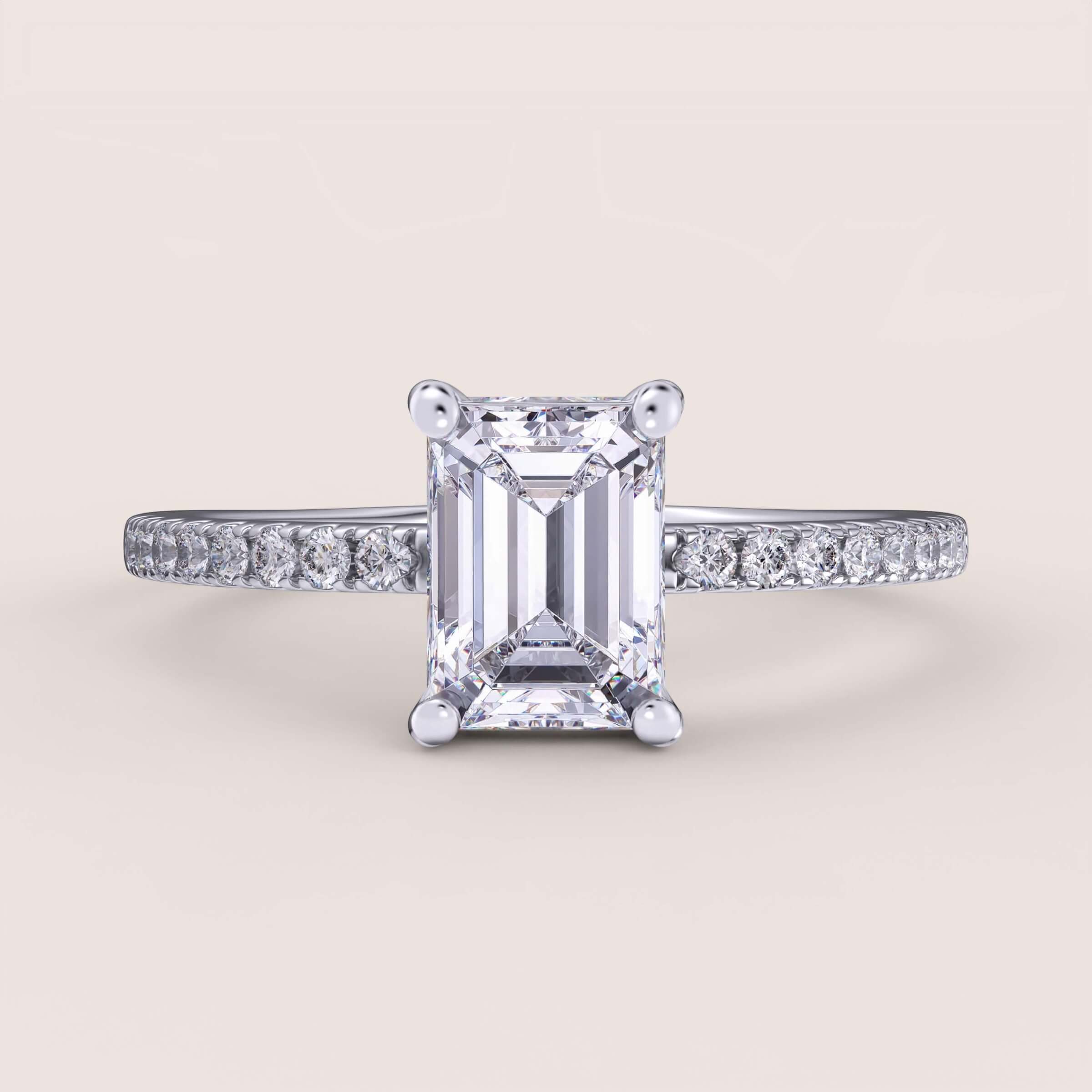 Ten wyjątkowy pierścionek zaręczynowy łączy w sobie ponadczasową elegancję i nowoczesny blask. Centralny kamień – diament laboratoryjny w szlifie Szmaragdowym o masie 1 ct – zachwyca niezwykłą grą świateł i intensywnym blaskie. Osadzony w czterech delikatnych łapkach, pięknie podkreśla smukłą linię pierścionka.