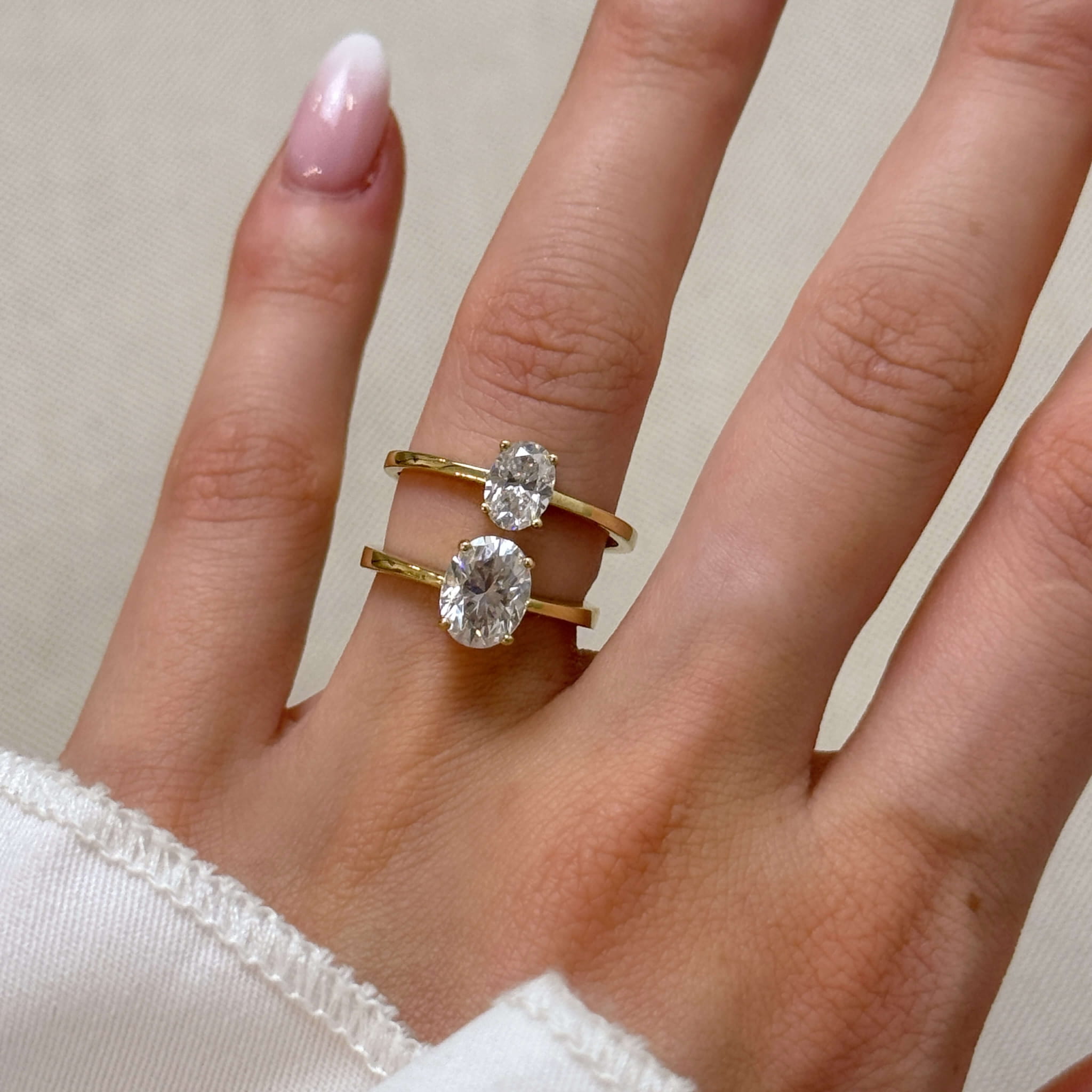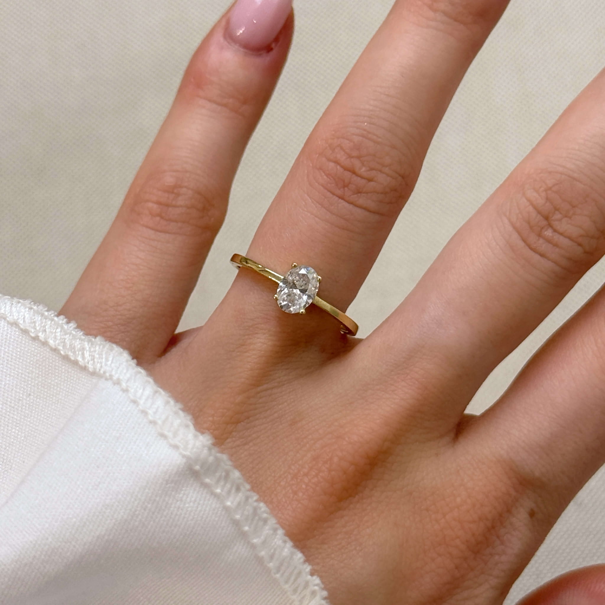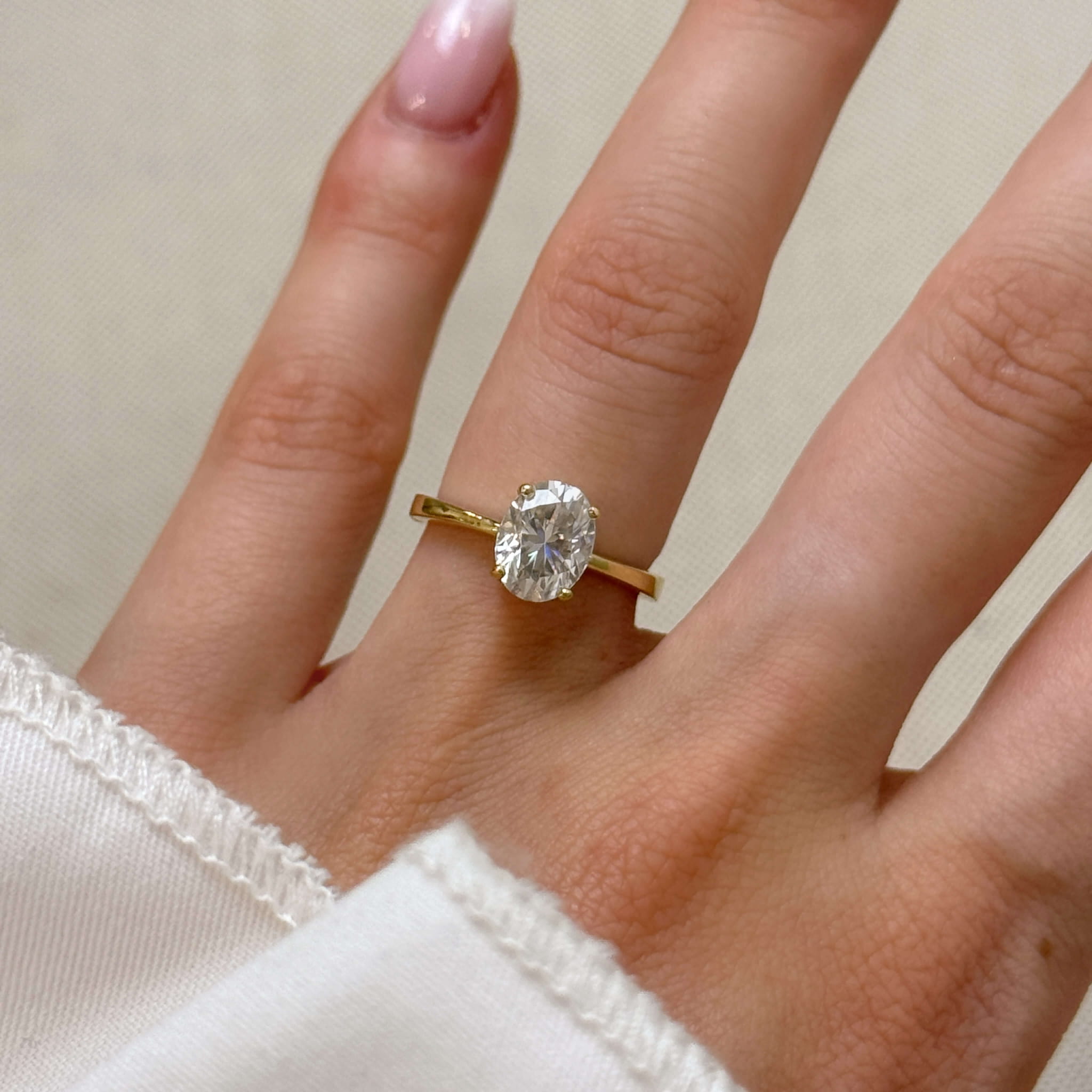 Pierścionek zaręczynowy Astra z moissanitem w szlifie owalnym to elegancka i minimalistyczna biżuteria wykonana ze złota (próba 585), z centralnie osadzonym kamieniem w koszyczkowej oprawie, która podkreśla jego wyjątkowy blask i doskonały szlif owalny, nadając mu wyjątkowy, nowoczesny wygląd.