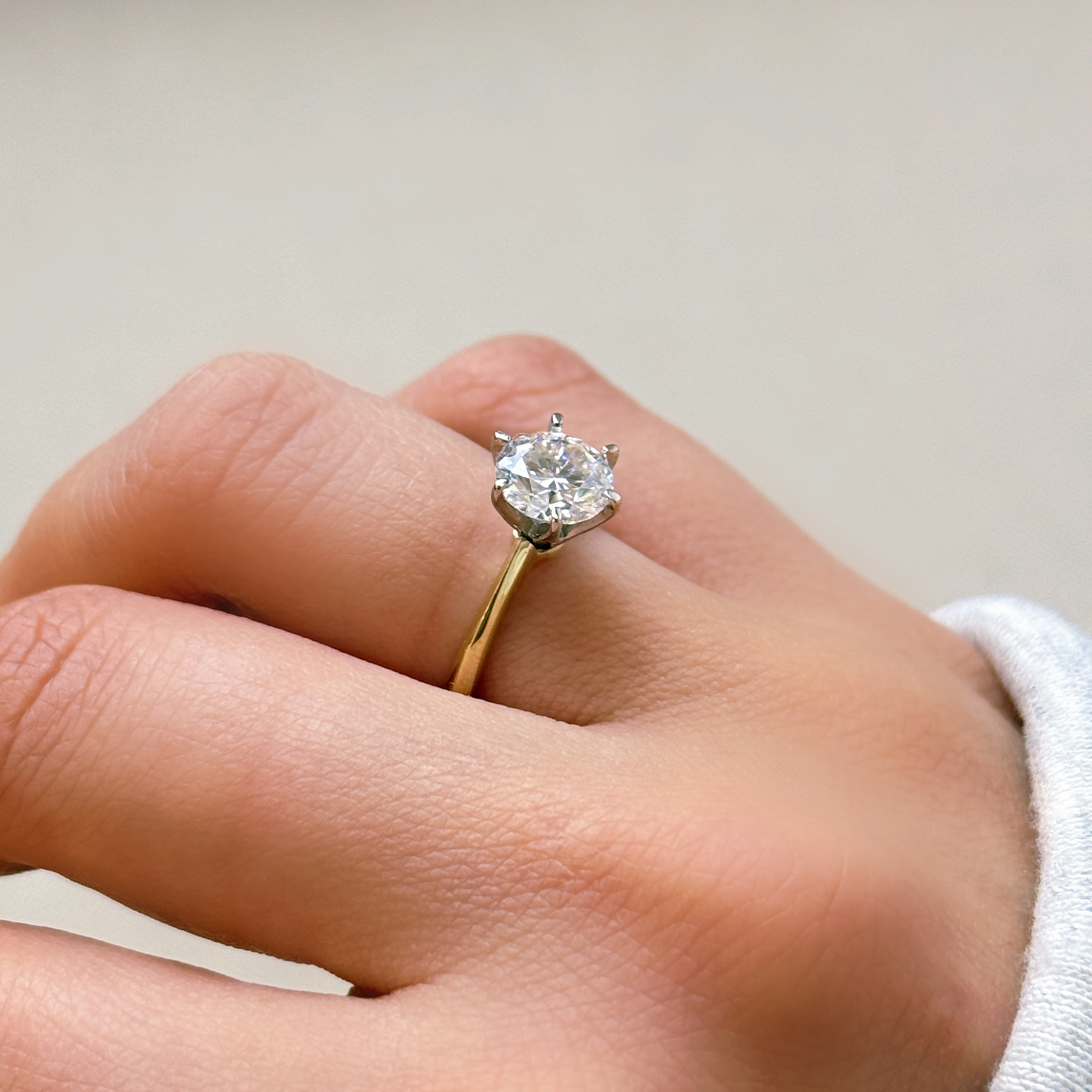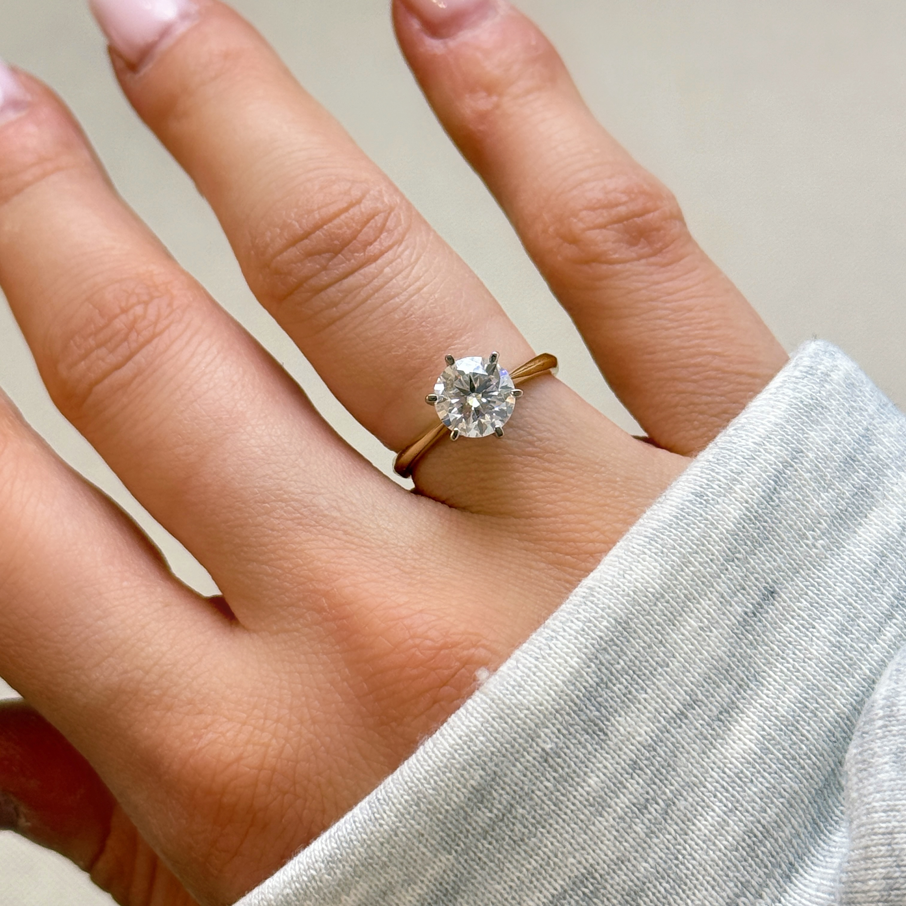 Pierścionek zaręczynowy Dream z moissanitem 1.5 ct w złocie dwukolorowym wyróżnia się formą, w której oprawa subtelnie unosi kamień, a smukła szyna zwęża się ku górze, tworząc lekką i elegancką linię. Dwukolorowe złoto 585 podkreśla blask moissanitu (D/VVS1), zapewniając ponadczasowy wygląd i komfort noszenia.
